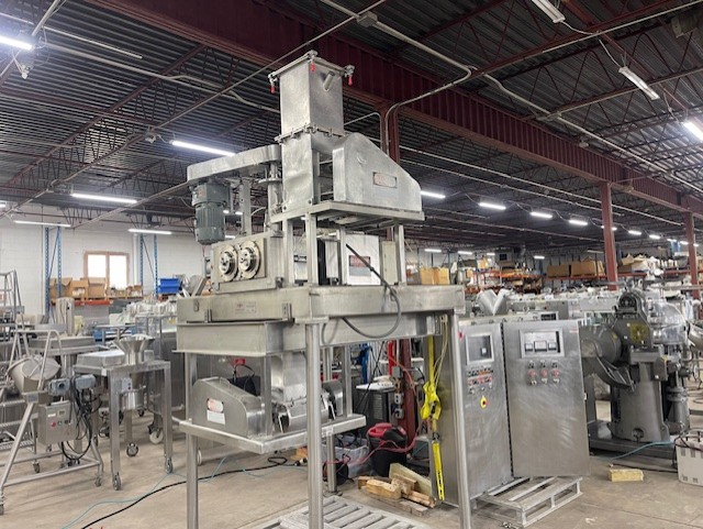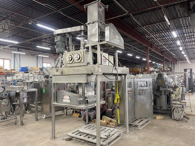 | Description | : | Fitzpatrick Model 4LX10D, 316 stainless steel, free standing roller compactor, chilsonator with onboard stainless steel Fitzmill Model DKASO12 knife rotor hammer mill and the system is rated from 250 – 400 kg of product per hour – depending on materials, application, machine configuration and environment being run in. Equipped with 4" OD horizontal metering screw with 1 Hp motor drive that eliminates vacuum dearation to 4 OD" vertical pre-compression screw with 5 Hp motor drive, that compresses product for more uniformity prior to feeding into the 4" OD x 10" long face cored product compaction rollers with 7.5 Hp motor drive and bulk densities of feed from 10 to 100 lbs per cubic foot and roll force of 17.5 KN/cm with roll gap range of 1mm to 6mm.horizontal screws, variable frequency speed controls with start and stop push buttons and e-stop. Mounted on (4) stainless steel leg |
