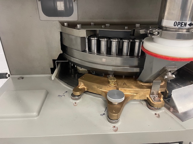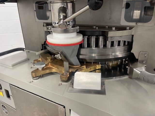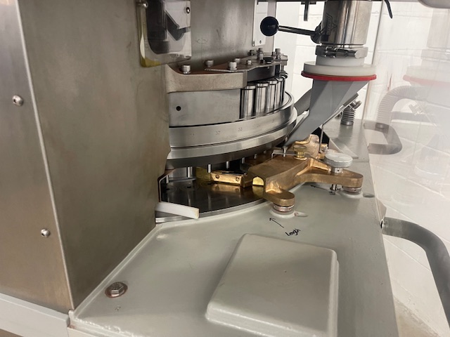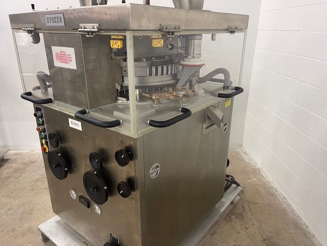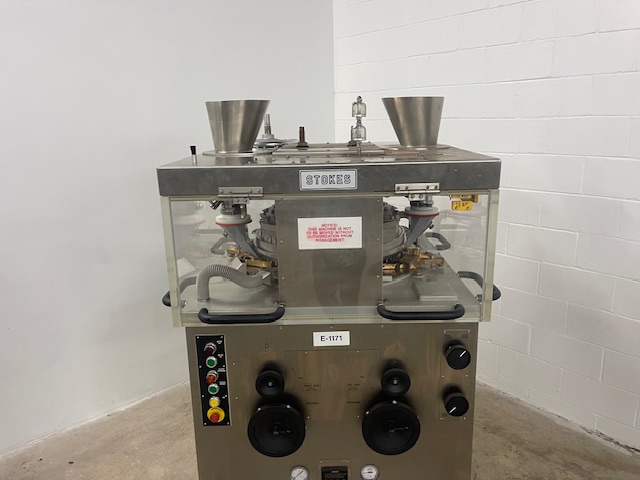 Stokes 328 Tablet Press. 45-Stations. 0.74" Max Tablet Diameter. 50 RPMS, Rated up to 270,000 Tablets Per Hour. Driven by a 10 Hp, 3 Phase, 60 Hz Motor. With Key-wayed upper punch guides, Double -Sided Press, with gravity feeder Stokes 328 with 45 stations double-sided