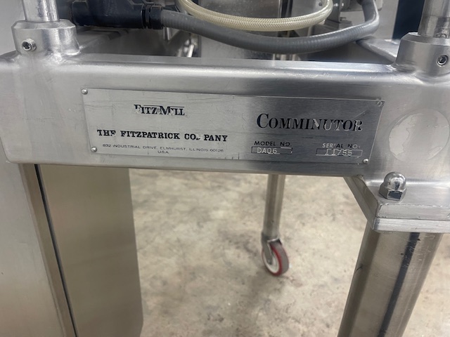 Fitzpatrick DASO6 Pan Feed S/S All stainless steel product contact surfaces and support base with galvanized pipe legs. 20" wide x 24" long product infeed pan with 4" high sides. Presently set for a 48" infeed height. Chamber measures 6" wide x 11" long. Unit has (4) rows of 4 fixed blades/hammers, sharp on one side, blunt hammers on opposing side. 6" wide x 16" long bottom discharge opening at 20" discharge height. Electrical control panel with on/off switches. Motor specs: 230/460 volt 3 phase drive