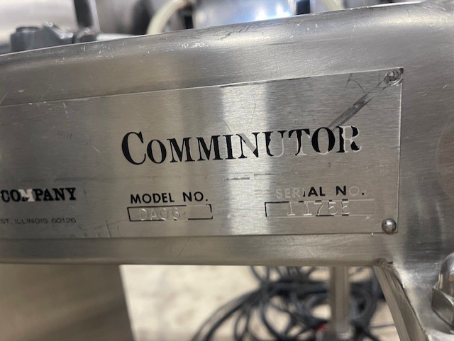 Fitzpatrick DASO6 Pan Feed S/S All stainless steel product contact surfaces and support base with galvanized pipe legs. 20" wide x 24" long product infeed pan with 4" high sides. Presently set for a 48" infeed height. Chamber measures 6" wide x 11" long. Unit has (4) rows of 4 fixed blades/hammers, sharp on one side, blunt hammers on opposing side. 6" wide x 16" long bottom discharge opening at 20" discharge height. Electrical control panel with on/off switches. Motor specs: 230/460 volt 3 phase drive