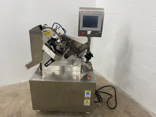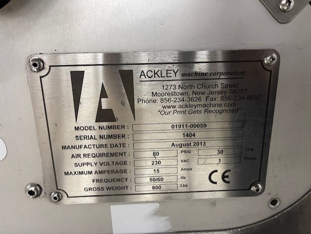 Ackley single row printer, speeds up to 60000 tablets/hour single side, 50000 tablets/hour double sided, model 01911-00059, 230 volt, CE rated, serial# 1404, built 2013
