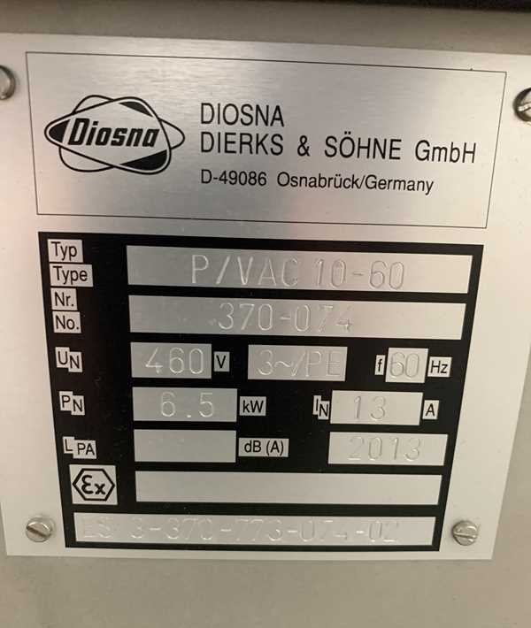 Diosna P-VAC 10-60 High Shear Mixer - Granulator with 25 Liter Bowl Model: P-VAC 10-60 Serial #: 370-074 Year of manufacture: 2013 25 liter single wall bowl is installed Pneumatic discharge Stainless steel construction Mounted on wheels