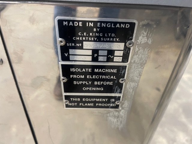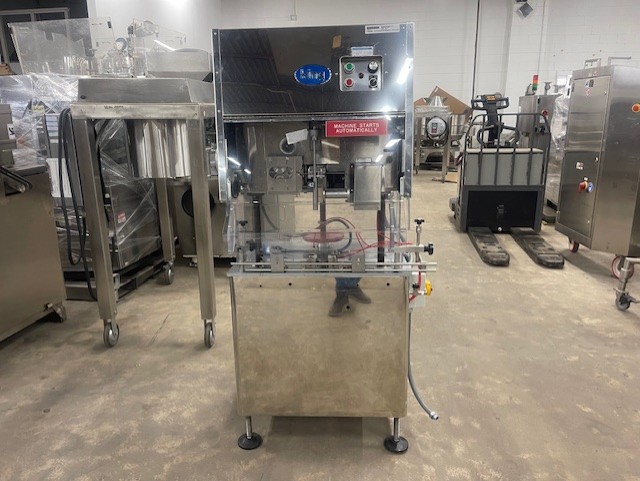 King CF100 Cottoner. Unit is constructed of Stainless Steel and can do up to 100 bottles per minute. Comes with control panel, plexiglass guarding and is mounted to a Stainless Steel enclosed frame. Containers Dimensions: 25mm to 75 mm diameter, 18mm to 200mm height, 10mm to 50mm neck size. Length of cotton is adjustable for different size bottles. Electrics: 3 Ph/60 Hz/220 volts