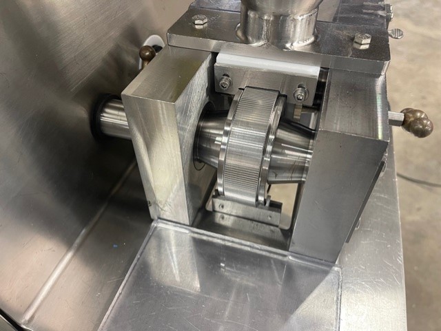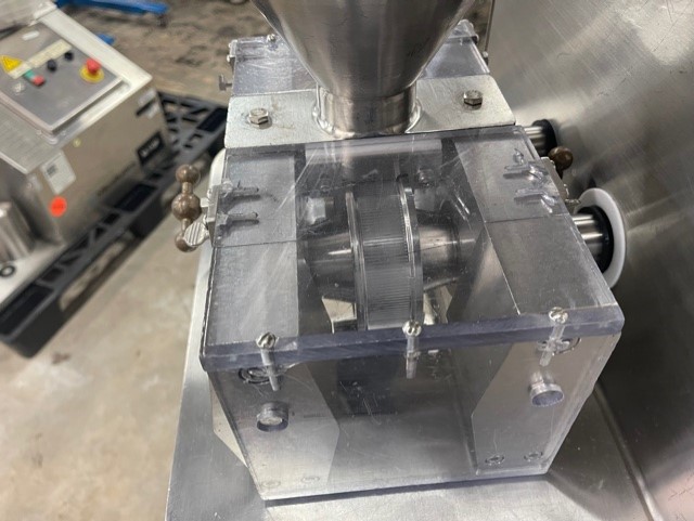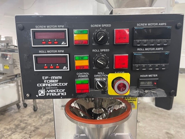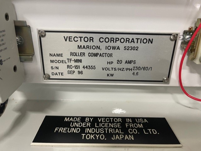 Vector Freund TF-Mini Roller Compactor. 3 Liter hopper volume, variable roll speeds of 2 - 12 RPM, roll gap of .015" to .030". Screw speeds of 0 - 80 RPM, digital readouts, Allen-Bradley programmable controls, Enerpac manual hydraulic pump. 1/2 Hp Roll & Screw motors. Voltages 230 Volt, 60 Hz, single phase