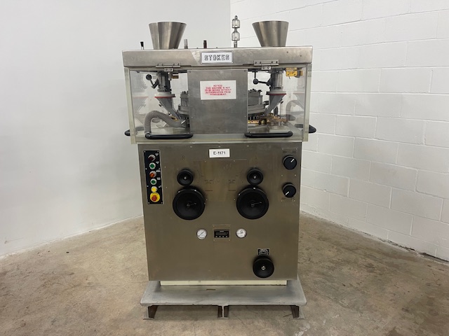 Stokes 328 Tablet Press. 45-Stations. 0.74" Max Tablet Diameter. 50 RPMS, Rated up to 270,000 Tablets Per Hour. Driven by a 10 Hp, 3 Phase, 60 Hz Motor. With Key-wayed upper punch guides, Double -Sided Press, with gravity feeder Stokes 328 with 45 stations double-sided