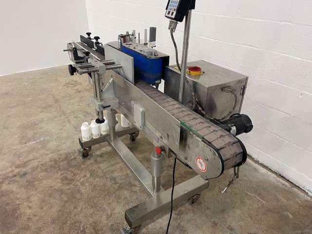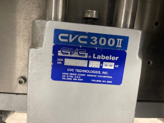 CVC Technologies Model CVC-300-II Automatic Pressure Sensitive Spot/Wraparound Labeling Machine, Serial Number 9908326. Rated up to 100 containers per minute, labeler has wraparound belt and handheld remote. With plastic tabletop conveyor chain and spacing wheel for synchronization of containers, labeler