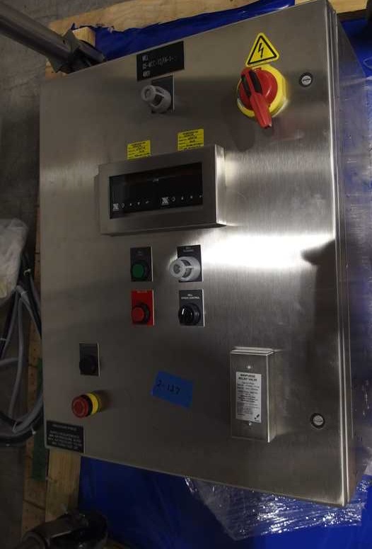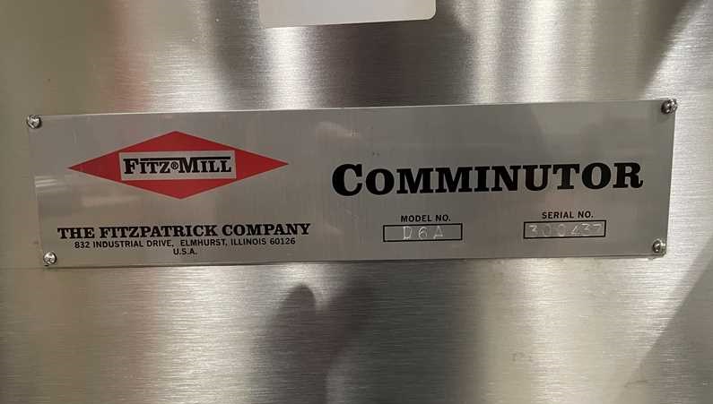 Fitzmill Model D6A, 316 stainless steel, pan fed reduction hammer mill with pounds of product per hour – depending on materials and application. Equipped with 26" long x 20" wide stainless steel feed pan, with 6" feed throat and (16) fixed stainless steel reversible knife / blunt blades with 12" long x 5" wide product discharge with safety grid and 34" floor clearance. Control panel has reset, start and stop push button controls. Mounted on (4) leg stainless steel frame