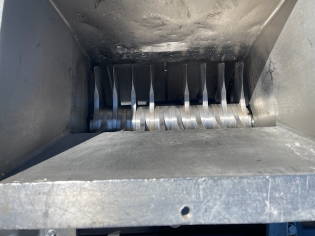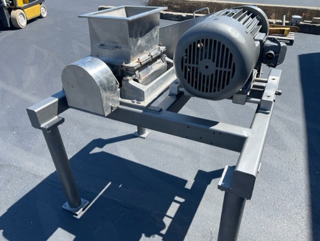 Fitzmill, Model DKAS012, hammer mill with pounds of product per hour – depending on materials and application. Stainless steel contact parts. Equipped with 12" x 8" feed throat (32) fixed impact / knife blades and 8" OD center bottom discharge port with 30" ground clearance and has side motor drive. Mounted on (4) leg frame, 30 HP, 3 Phase, 60 cycles, 230-460 volt motor