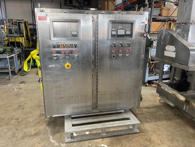 | Description | : | Fitzpatrick Model 4LX10D, 316 stainless steel, free standing roller compactor, chilsonator with onboard stainless steel Fitzmill Model DKASO12 knife rotor hammer mill and the system is rated from 250 – 400 kg of product per hour – depending on materials, application, machine configuration and environment being run in. Equipped with 4" OD horizontal metering screw with 1 Hp motor drive that eliminates vacuum dearation to 4 OD" vertical pre-compression screw with 5 Hp motor drive, that compresses product for more uniformity prior to feeding into the 4" OD x 10" long face cored product compaction rollers with 7.5 Hp motor drive and bulk densities of feed from 10 to 100 lbs per cubic foot and roll force of 17.5 KN/cm with roll gap range of 1mm to 6mm.horizontal screws, variable frequency speed controls with start and stop push buttons and e-stop. Mounted on (4) stainless steel legs. |
